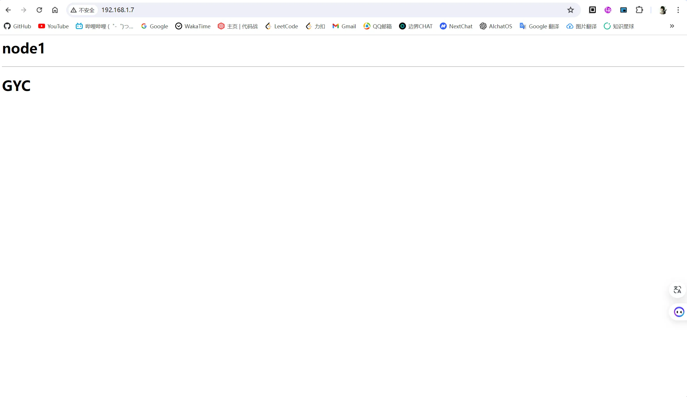 powershellPS C:\Users\30372> curl http://192.168.1.7 StatusCode : 200 StatusDescription : OK Content : <h1>node1</h1> <hr> <h1>GYC</h1> RawContent : HTTP/1.1 200 OK Connection: keep-alive Accept-Ranges: bytes Content-Length: 34 Content-Type: text/html Date: Tue, 21 May 2024 15:42:47 GMT ETag: "664b65d6-22" Last-Modified: Mon, 20 May 2024 15... Forms : {} Headers : {[Connection, keep-alive], [Accept-Ranges, bytes], [Content-Length, 34], [Content-Type, text/html]. ..} Images : {} InputFields : {} Links : {} ParsedHtml : mshtml.HTMLDocumentClass RawContentLength : 34